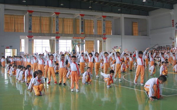 在入場式比賽中,22個班級的同學步伐整齊、口號洪亮、動作有力、精神飽滿,賽場上充滿青春的活力,充滿時代的氣息,充分體現(xiàn)了小學生朝氣蓬勃、青春飛揚的面貌,展示了學生拼搏進取、團結一致的精神,迸發(fā)出學生的活力與激情。在各班領操員的帶領下,同學們一個個精神抖擻、氣宇軒昂,他們邁著整齊的步伐走進操場,隨著音樂的響起,從伸展運動到整理運動,一伸手,一抬腿,每一式都剛勁有力,把廣播體操和健身操的簡單規(guī)范、明快流暢、橫平豎直的風格特點展露無遺。他們的動作姿態(tài)到面部表情,都體現(xiàn)了當代小學生活潑開朗、快樂向上的校園生活和陽光體育的精神風貌。賽場上,尤其是一年級的學生,隊員們個個臉上熱情洋溢,朝氣蓬勃,動作整齊劃一,張弛有力,健身操表演結合迷人的微笑彰顯了他們的青春活力,流暢自然的動作,嘹亮的口號贏得在場觀眾的陣陣掌聲,也得到了主席團和評委們的充分認可,給在場的所有觀眾帶來了一場完美的視覺盛宴。