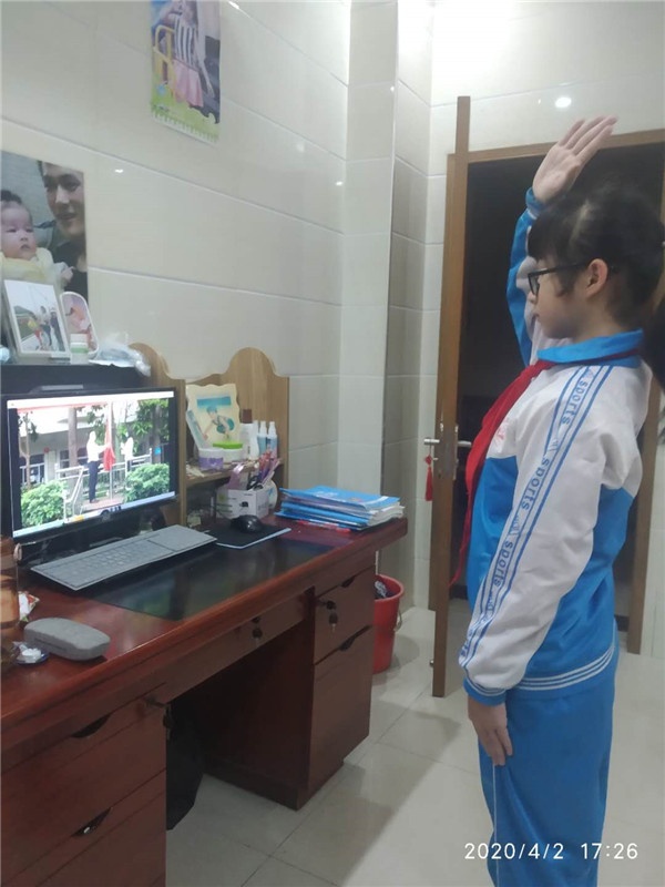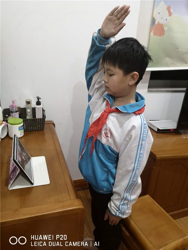 4月1日上午,埒西一小學(xué)全體師生通過線上直播的方式共同觀看由學(xué)校少工委錄制的升旗儀式視頻。活動第一項內(nèi)容是主題升旗儀式,隨著輔導(dǎo)員黃老師一聲:“升國旗,奏唱國歌,少先隊員敬隊禮”。嘹亮的《義勇軍進行曲》在耳畔響起,屏幕上鮮艷的五星紅旗冉冉升起,孩子們在家里整裝肅立,少先隊員向鮮艷的國旗敬禮,表達他們對國家的熱愛,對先烈的崇敬。