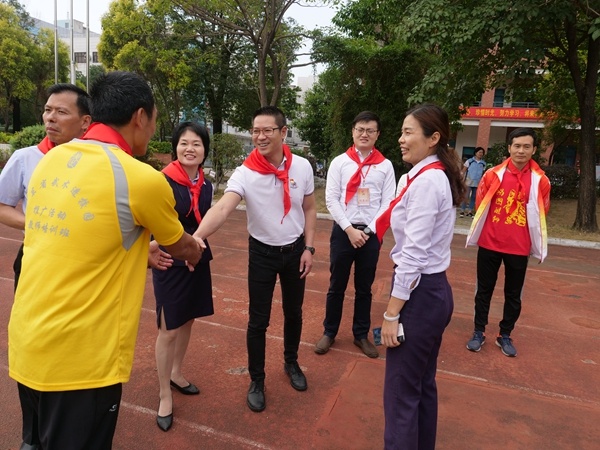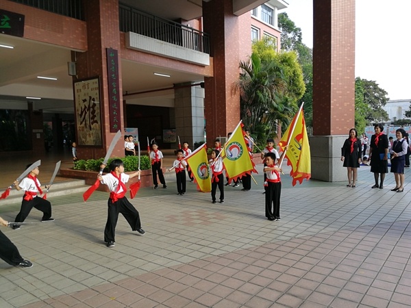 11月8日下午的操場(chǎng)、校道和一樓大堂鑼鼓喧天,舞獅迎賓,熱鬧非凡,原來是中山市小欖鎮(zhèn)中國少年先鋒隊(duì)第三次代表大會(huì)在升平小學(xué)舉行,有來自小欖鎮(zhèn)的滘口小學(xué)、永寧小學(xué)、升平小學(xué)的醫(yī)療輔助隊(duì)、鼓號(hào)隊(duì)和動(dòng)感中隊(duì)參加了本次助興和節(jié)目展示活動(dòng)。