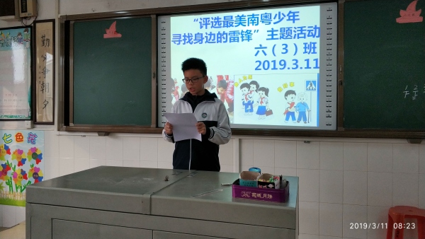 接著,各班將“評選最美南粵少年”主題活動與弘揚雷鋒精神活動結(jié)合起來,讓本班的最美南粵少年進行演講,號召同學(xué)們“尋找身邊的雷鋒”。他們用富有感染力的語言,激發(fā)了同學(xué)們學(xué)習(xí)雷鋒的熱情,讓同學(xué)們明白——學(xué)雷鋒不是為了得到表揚,而是在盡自己所能去幫助他人,去創(chuàng)建一個和諧溫暖的生活環(huán)境。