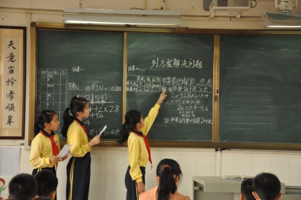 隨著清脆的上課鈴聲響起,五年級的徐惠霞主任為參與研討活動的老師們上了一節(jié)精彩的小組合作學習研討展示課《列方程解決問題》。徐主任采用了小組合作模式充分體現(xiàn)了“自主學習、自主探究”的教學特點,通過多次的小組合作學習來展現(xiàn)學生對解方程的理解,使學生樂在課堂中。學生以小組合作的形式對例題進行研究,然后把小組研究成果板書到黑板上,再展示給大家看,學生的精彩講演贏得了陣陣掌聲。學生們在在愉快的合作過程中學到知識。