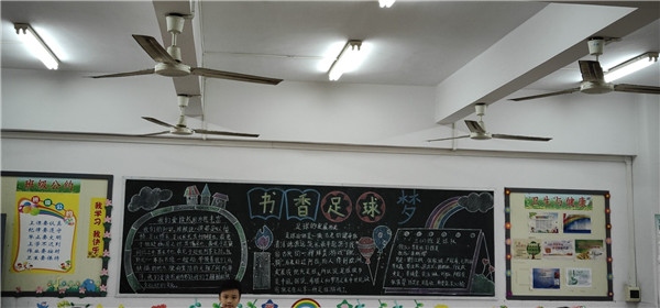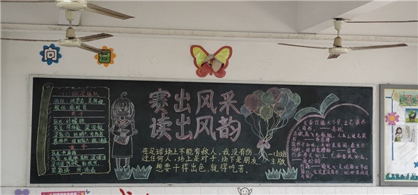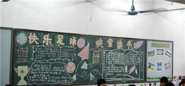本次黑板報評比,一至六年級各班都積極參加,每個班都運(yùn)用自己所熟悉的繪畫技巧,圍繞“詩書養(yǎng)性 運(yùn)動健體”的主題進(jìn)行設(shè)計,版面和書寫能力有了很大的進(jìn)步,板報中的插畫生動地體現(xiàn)了足球賽場內(nèi)外的熱烈氣氛,閱讀書海的魅力。
