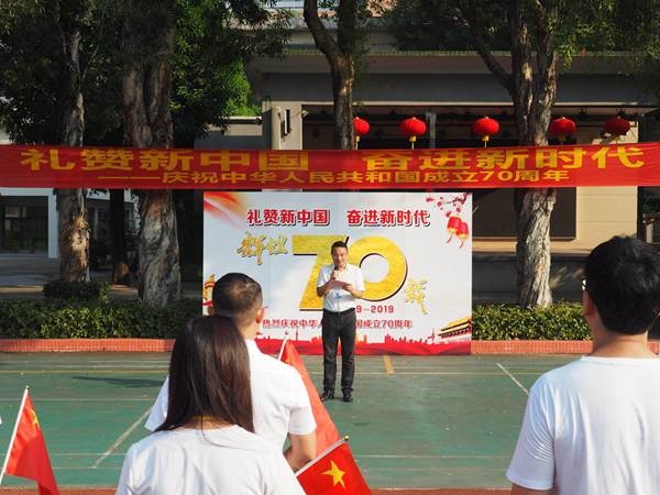 9月30日早上,迎著朝陽,鮮艷的五星紅旗冉冉升起,全體師生一起唱響雄壯的國歌。之后,董旌武校長發(fā)表了“禮贊新中國,奮進(jìn)新時代”的致詞。董校長指出,新中國建立結(jié)束了中國100多年來被侵略、被奴役的歷史,新中國成立70年以來,尤其是改革開放40年以來,中國正日新月異的改變著面貌。今天,我們偉大的祖國經(jīng)濟(jì)發(fā)展,政治能力,社會進(jìn)步,民族團(tuán)結(jié),各項(xiàng)事業(yè)興旺發(fā)達(dá),實(shí)現(xiàn)了從站起來到富起來再到強(qiáng)起來的跨越,中華大地欣欣向榮,春潮涌動,一派生機(jī)勃勃的景象。弘揚(yáng)并踐行愛國奮斗精神,落腳點(diǎn)在立足本職工作做貢獻(xiàn),立足本職好好學(xué)習(xí)。我們只有把個人理想追求融入到波瀾壯闊的國家和民族事業(yè)中,立足新的歷史方位,向著民族復(fù)興的偉大夢想進(jìn)發(fā),始終與黨和國家的發(fā)展同向同行,以更加堅定的家家國情懷、更加高遠(yuǎn)的理想追求,更加執(zhí)著的報國信念投身祖國各項(xiàng)事業(yè),好好學(xué)習(xí),努力工作,在勇于圓夢的民族自信中實(shí)現(xiàn)報國之志。董校長的講話為學(xué)校下一階段開展主題教育教學(xué)工作指明了方向。