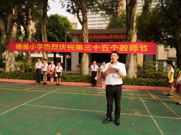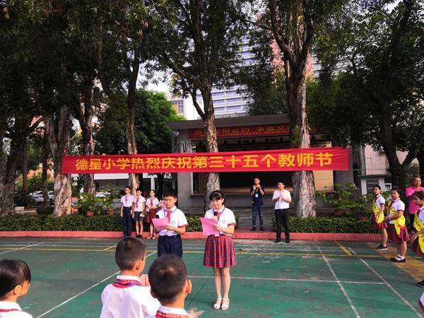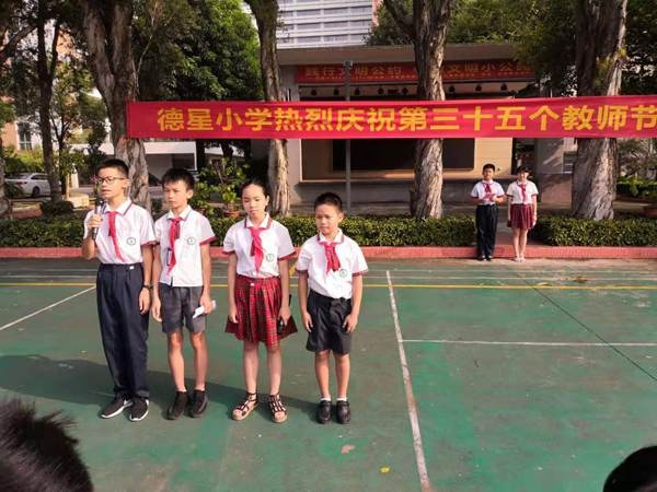 早上8點,德星小學(xué)第二周升旗儀式準(zhǔn)時開始,當(dāng)五星紅旗在肅穆中徐徐升起后,學(xué)校兩位學(xué)生主持宣布“德星小學(xué)熱烈慶祝第35個教師節(jié)”活動現(xiàn)在開始!