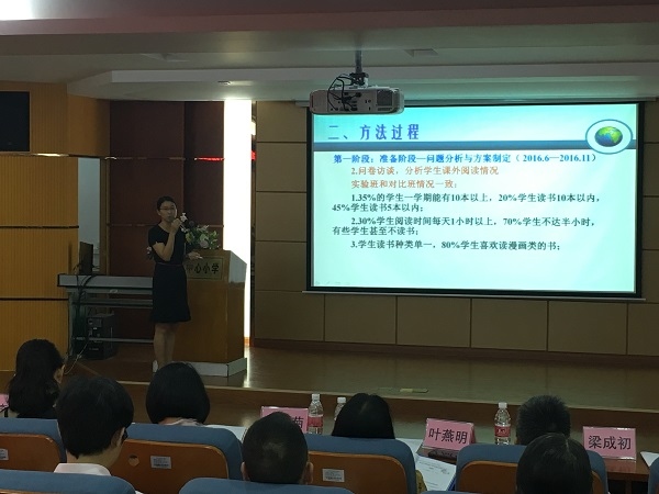 會上首先由課題主持人小欖鎮(zhèn)績東二小學(xué)何小玲主任進(jìn)行結(jié)題報告,全方面地展示了課題組三年來的成果,課題組成員努力探索的學(xué)?;趩卧黝}閱讀的小學(xué)生閱讀能力培養(yǎng)的模式和目標(biāo),力求激發(fā)學(xué)生學(xué)習(xí)興趣,促進(jìn)小學(xué)生閱讀能力的培養(yǎng)。