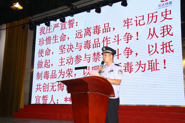 活動在奏唱國歌中拉開帷幕。菊城中學(xué)文炳發(fā)副校長致辭。升平派出所警長凌勇宣讀禁毒倡議書,帶領(lǐng)同學(xué)們禁毒宣誓?;顒友埩诵戽?zhèn)禁毒社工文麗瓊作禁毒知識講座,通過動畫、案例讓同學(xué)們認(rèn)識了什么是毒品,了解了毒品有多毒,如何正確防范、抵制毒品。