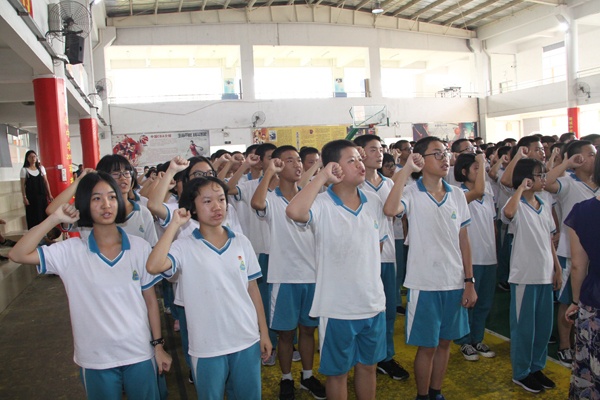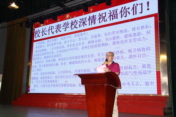 接著,繼初一學(xué)生代表萬冰冰同學(xué)為學(xué)長們獻上熱誠祝福后,初二、初三考生分別在雷毅、陸治君同學(xué)的帶領(lǐng)下,先后重溫了中考誓言。鏗鏘的誓詞,令人心潮澎湃,斗志昂揚!