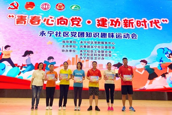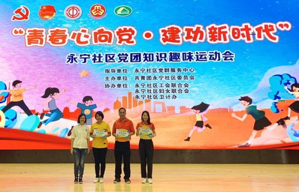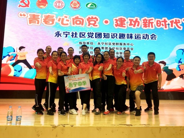 為了活躍學(xué)校黨支部及教師隊(duì)伍文化氛圍,更好地促進(jìn)黨群之間的交流,激發(fā)教師學(xué)習(xí)黨團(tuán)知識(shí)的積極性,增強(qiáng)愛(ài)國(guó)愛(ài)黨意識(shí),不斷向黨組織靠攏,落實(shí)黨中央立德樹(shù)人的根本任務(wù)。由青年教師及部分黨員骨干教師組成的永中代表隊(duì)在陳清茂校長(zhǎng)的帶領(lǐng)下,于2019年10月27日上午參加永寧社區(qū)“青春心向黨,建功新時(shí)代”黨團(tuán)知識(shí)趣味運(yùn)動(dòng)會(huì)并取得兩個(gè)單項(xiàng)第二名,總成績(jī)二等獎(jiǎng)的優(yōu)異成績(jī)。