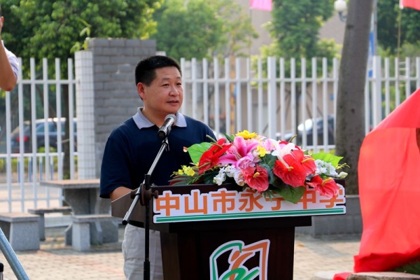 在楊副校長的主持下,章偉志校友、鄧永飛副主任、布寶文委員、陳清茂校長共同為中山市永寧中學(xué)“偉志苑”揭幕,將活動推向高潮。章偉志校友在隨后的講話中回憶自己在永寧中學(xué)的青蔥歲月,感慨良多。建設(shè)“偉志苑”的初衷就是讓永中學(xué)生的安全得到保障,實(shí)現(xiàn)人車分流,讓學(xué)校的環(huán)境更加優(yōu)美,硬件設(shè)施更加完善?!皞ブ驹贰钡膸卓么髽?,有他對母校和學(xué)子們的祝福和寄托。一棵樹木的長成,離不開澆灌,正如學(xué)子們也離不開老師的辛勤付出和教育。章偉志校友愿母校能和大樹一樣,生生不息,桃李滿園,殷切希望學(xué)弟學(xué)妹們以孔子的人格為標(biāo)尺,以學(xué)修身,為國修業(yè),穩(wěn)穩(wěn)地走向更高的知識殿堂,以優(yōu)異成績報答母校。接著,初一9班的黃安琦同學(xué)代表全體永中學(xué)子向校友、領(lǐng)導(dǎo)和老師們鄭重承諾,一定會發(fā)揚(yáng)永中的“博愛之心”和“奉獻(xiàn)精神”,做一名擁有一顆博愛之心的永中學(xué)子;一定會勵志勤學(xué),立鴻鵠志,做奮斗者,把校友們傳遞的愛心接力棒接過來,讓愛心行動傳承下去。