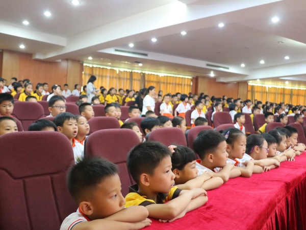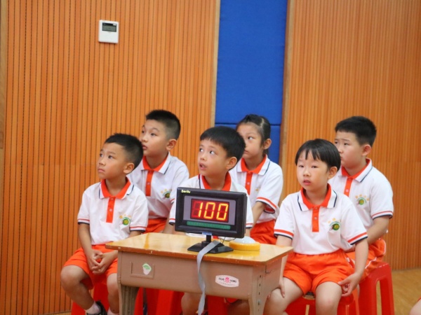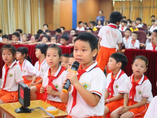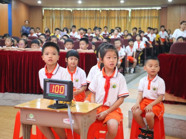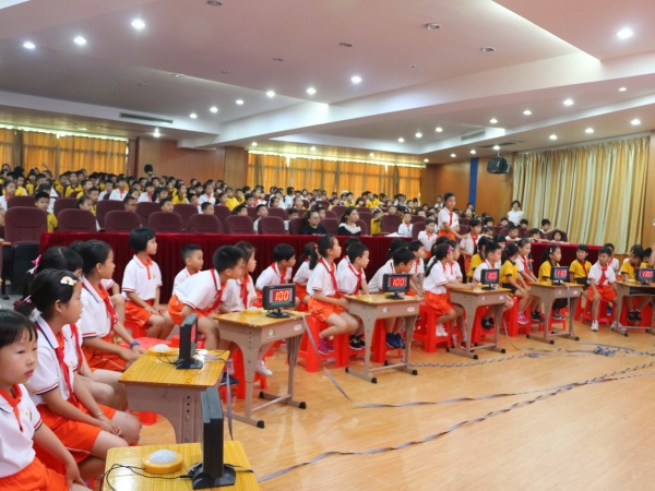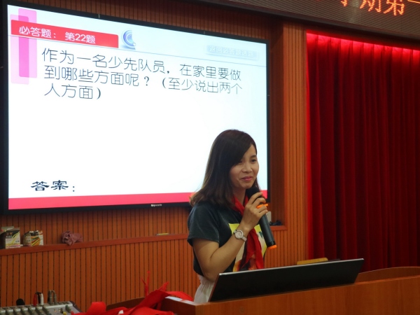本次入隊培訓以知識競賽的形式展開,由大隊副輔導員王甜老師和關永釧老師組織。競賽開始前,王甜老師帶領所有隊員和同學們邊唱隊歌邊做手語操。接著,各中隊少先隊員代表和預備隊員組成答題小隊。本次競賽分為必答題、搶答題和實操比賽題三個環(huán)節(jié)。必答題要求各隊先選擇題號,每隊必須答3題,答對加10分答錯或不答不扣分,觀眾可以補答。在第一輪的比賽中所有的隊伍抽中的題目全都答對,這也體現(xiàn)了隊員們對少先隊知識都比較了解。最激動人心的是搶答題環(huán)節(jié),這需要隊員們眼疾手快,通過這一環(huán)節(jié)的比拼,每一個小隊的分數(shù)也拉開了差距。實操項目,要求參賽隊員在規(guī)定時間內自己系好紅領巾,關永釧老師面對所有隊員和預備隊員們當場演示正確系紅領巾的方法和敬標準隊禮的姿勢。在整個活動中各中隊隊員們和預備隊員們參與的積極性非常高。
