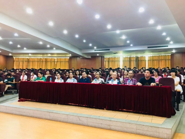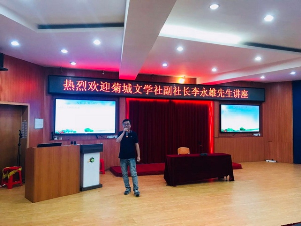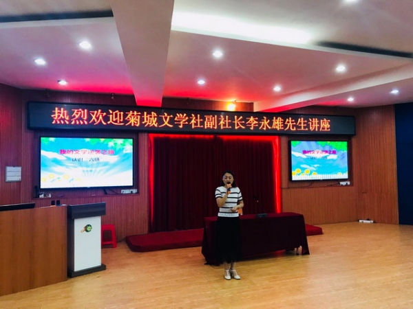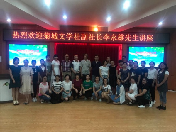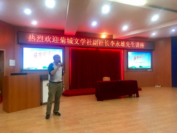 綠樹陰濃夏日長,菊小詩意正芬芳。值菊城小學(xué)“2018年校園詩歌節(jié)”正如火如荼開展之際,2018年5月15日下午,小欖鎮(zhèn)菊城文學(xué)社的一批作家、詩人也蒞臨菊小校園,給同學(xué)們帶來了一場“文學(xué)漫談”。 廣東中華詩詞學(xué)會(huì)會(huì)員、菊城文學(xué)社社長伍漢文先生、菊城文學(xué)社副社長李永雄先生、菊城文學(xué)社理事何永成先生應(yīng)邀來學(xué)?!皞鹘?jīng)送寶”,菊城小學(xué)分管語文行政周鵬副主任、中國詩歌學(xué)會(huì)會(huì)員、浙江省作協(xié)會(huì)員溢騰先生、全體語文教師,四到六年級(jí)的優(yōu)秀同學(xué)代表齊聚該校階梯教室聆聽講座。