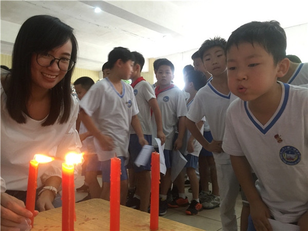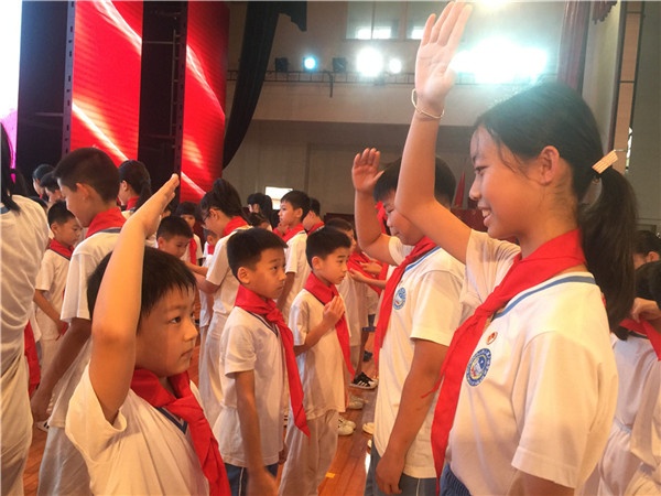 大隊(duì)輔導(dǎo)員洪智躍老師對(duì)新隊(duì)員表示了祝賀,對(duì)他們提出了殷切的期望;他帶領(lǐng)全體隊(duì)員在隊(duì)旗下莊嚴(yán)呼號(hào),“時(shí)刻準(zhǔn)備著,為共產(chǎn)主義事業(yè)而奮斗!”這嘹亮的聲音,在校園的上空飄蕩。在火紅的隊(duì)旗下,望著胸前兩束跳躍的火焰,孩子們滿臉的笑容,充滿對(duì)祖國未來的信心!