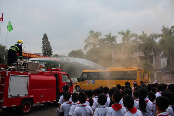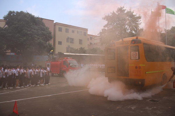 為了將這次演練落到實(shí)處,能取得較好的效果。在演練活動(dòng)前制定了詳細(xì)的校車疏散演練方案。9月12日下午3時(shí),隨著嘹亮的進(jìn)行曲音樂聲,吉安學(xué)校全體司機(jī)、隨車教師及師生有序地進(jìn)入操場(chǎng),部分家長(zhǎng)也到場(chǎng)觀摩。3時(shí)8分,小欖鎮(zhèn)文體教育局盧穎禧局長(zhǎng)宣布演練開始,隨著發(fā)令員的一聲槍響,吉安學(xué)校1號(hào)校車從主席臺(tái)前方徐處開來,廣播里傳來主持人的解說:現(xiàn)在吉安學(xué)校校車在公路上正常行駛,突然學(xué)生大叫:校車有煙!……司機(jī)、隨車教師和乘車同學(xué)分別按照校車消防應(yīng)急疏散方案的指令和要求,快速撤離事故校車,到達(dá)指定地點(diǎn)集合,沒有發(fā)生任何意外情況,整個(gè)演練過程做到快速、有序、安全,較好的完成逃生演練的任務(wù)。接著,由吉安學(xué)校負(fù)責(zé)安全工作的農(nóng)洪藝?yán)蠋煟驇熒鷤兘榻B安全錐和滅火器在遇到危險(xiǎn)時(shí)候正確使用的方法。通過模擬演練和講解增強(qiáng)了師生在遇到緊急情況下逃生的技能。