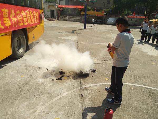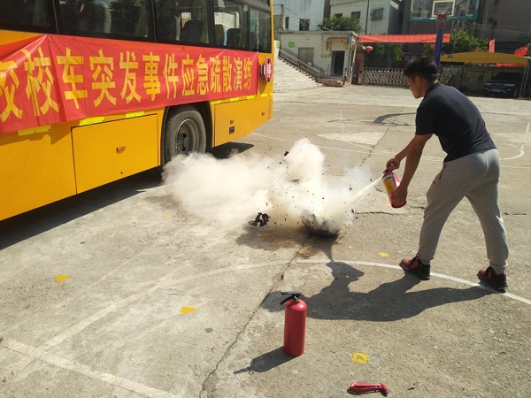 活動(dòng)由學(xué)校負(fù)責(zé)安全工作的王曠主任主持,他首先講解了校車運(yùn)行中易出現(xiàn)的不安全情況,如起火自燃、交通事故等,接著他從安全應(yīng)急門、安全錘、滅火器的使用方法,突發(fā)事故中如何保護(hù)自己等方面講述了突發(fā)事件中的逃生技巧,還現(xiàn)場演示了滅火器的使用。最后,由校車司機(jī)、護(hù)送老師、乘車學(xué)生現(xiàn)場模擬了突發(fā)事件發(fā)生時(shí)的逃生過程,在校車發(fā)生意外時(shí),教師和司機(jī)第一時(shí)間打開車門和安全應(yīng)急門,學(xué)生在老師和司機(jī)的護(hù)送下安全的逃離校車,到遠(yuǎn)離校車的安全地點(diǎn)集中,整個(gè)過程用時(shí)不到1分鐘,達(dá)到了演練的預(yù)期效果。