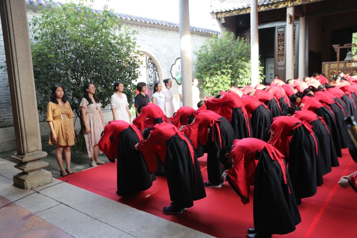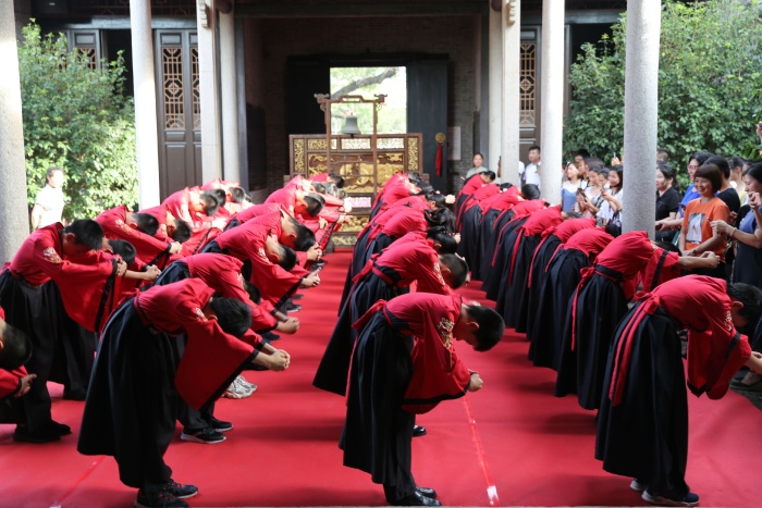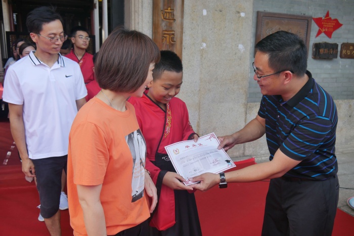 當天下午4:30,在具有147年歷史的煙洲書院門前,98名小學畢業(yè)生身穿紅黑搭配的漢服,顯得特別有精神。今年的畢業(yè)禮打破以歌舞、相聲、小品等形式為主的畢業(yè)典禮模式,改為突出傳統(tǒng)“禮”的感恩儀式?;顒酉扔牲S文華校長致詞,他語重深長地說:“同學們,感恩會讓我們發(fā)現(xiàn)生命的富有和多彩,感恩會讓我們領悟生活的饋贈和恩典。讓我們心懷感恩,用愛回報身邊的每一個人……”校長意味深長、熱情洋溢的話語,激勵著在場的所有人。優(yōu)秀家長和優(yōu)秀學生代表分別致詞,他們發(fā)言完畢,六年級(1)班和六年級(2)班分別進入書院中堂行“感恩之禮”。99名學生在羅勇志老師帶領下,一拜先師孔子,二拜父母,三拜恩師,誦讀了《弟子規(guī)》和《少年中國說》,場面莊嚴肅穆又高昂激蕩,感人至深,不少學生和家長悄悄流下了依依不舍的淚水。禮拜結(jié)束后,家長領著自己的孩子走出書院大門,就像他們6年前領著孩子進入煙洲小學一樣,來到舞臺上接過校長頒發(fā)的畢業(yè)證書和紀念品,臉上洋溢著幸福的笑容。最后,孩子們通過一個詩歌朗誦的節(jié)目告別母校,并向國旗宣誓:我們將不負母校的期盼,不負恩師的厚望,全力以赴,再創(chuàng)輝煌!?