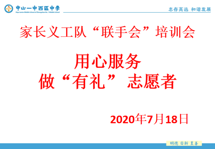 炎炎夏日,中山市創(chuàng)建第六屆全國文明城市工作進(jìn)入攻堅(jiān)沖刺階段。為進(jìn)一步推動(dòng)中山一中西區(qū)中學(xué)家長志愿服務(wù)活動(dòng)的深入開展,提高志愿服務(wù)整體水平,確保志愿服務(wù)工作在暑假期間的常態(tài)化,打造一支高素質(zhì)的家長志愿者隊(duì)伍,7月18日上午及7月22日晚上,學(xué)校分年級(jí)組織家長志愿者開展主題為“用心服務(wù),做‘有禮’志愿者”的專題培訓(xùn)。