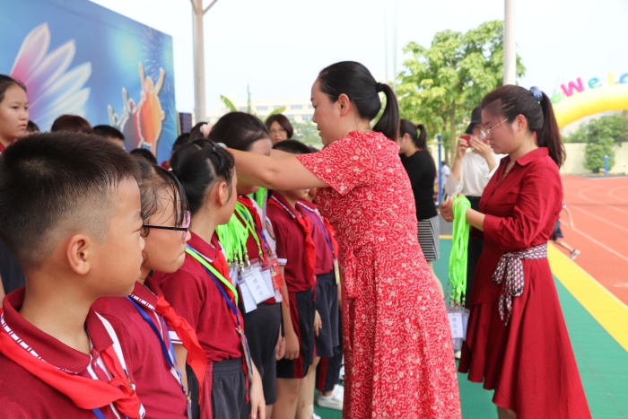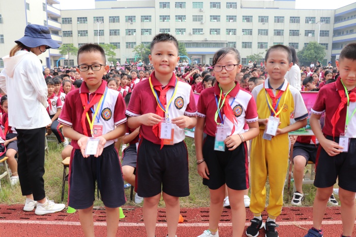通過教師舉薦、班級選拔的方式,共選拔出100名優(yōu)秀通訊員代表,路海云校長與中山報業(yè)傳媒股份有限公司教育工作室總監(jiān)羅展新女士、中山日報《鳳凰花開》校園??骶廃S漢英一同為聚星通訊員們戴上通訊員證。