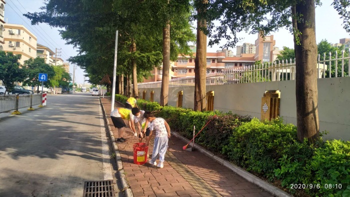 教務(wù)主任莫振佩帶領(lǐng)部分人員負責校門口廣學路的垃圾清理,主要包括移除校園周邊花圃里的枯樹枝,清除白色垃圾、煙頭,清掃路邊的樹葉等,大家?guī)R清潔工具很快行動,個別家長志愿者也主動加入勞動隊伍。德育主任許向陽帶領(lǐng)各年級級長們對各年級的教室、走廊、廁所等衛(wèi)生情況進行全面排查,對有疏漏部分立即處理。德育主任梁超勝負責廚房的衛(wèi)生檢查以及校門口、班級、校車上疫情防控物資的落實,如人體測溫儀、消毒液、防護口罩等。校長黃飛躍負責張貼校門口“一米間隔”防控標識和宣傳標語。經(jīng)過一個小時的奮戰(zhàn),自查整改工作初步完成。