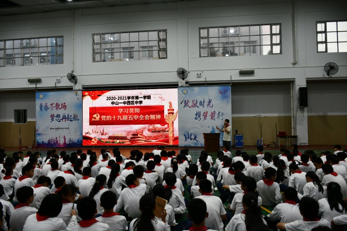 為了幫助少先隊(duì)員更好地學(xué)習(xí)黨的十九屆五中全會(huì)精神,了解“‘十四五’規(guī)劃”和二〇三五年遠(yuǎn)景目標(biāo),11月19日,中山一中西區(qū)中學(xué)少工委緊密聯(lián)系初一初二少先隊(duì)員的學(xué)習(xí)、接受能力和認(rèn)知特點(diǎn),分年級(jí)開展“學(xué)習(xí)五中全會(huì)精神 紅領(lǐng)巾永遠(yuǎn)心向黨”班隊(duì)會(huì)活動(dòng),掀起了學(xué)習(xí)黨的十九屆五中全會(huì)精神的熱潮!