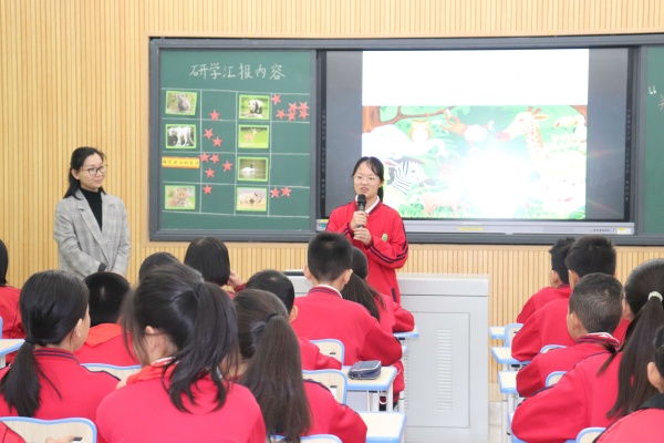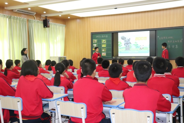 匯報(bào)課首先以視頻的形式回顧了校外實(shí)踐研學(xué)的過程,接著每個(gè)小組進(jìn)行匯報(bào)展示。八個(gè)小組以不同的野生動(dòng)物為主題,通過精美的PPT、生動(dòng)的視頻、有趣的話劇、自信的匯報(bào),將野生動(dòng)物的特點(diǎn)、現(xiàn)狀、保護(hù)和未來暢想全面呈現(xiàn)出來,并呼吁在相關(guān)法律法規(guī)的保護(hù)下,要正確關(guān)愛野生動(dòng)物,保護(hù)美好家園。第三環(huán)節(jié)是匯報(bào)評價(jià)活動(dòng)。學(xué)生通過小組匯報(bào)情況,結(jié)合評價(jià)表,從內(nèi)容、形式、臨場發(fā)揮等方面,選出“匯報(bào)成長組”,在相互欣賞、相互學(xué)習(xí)中共同成長。第四環(huán)節(jié)是談收獲,完成自我學(xué)習(xí)評價(jià),最后是師生暢談對匯報(bào)課的感受。