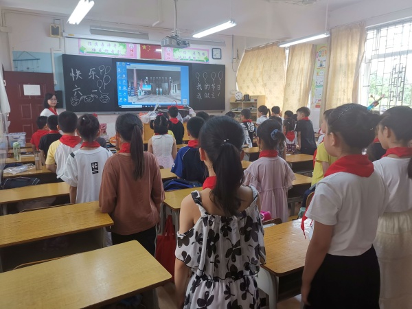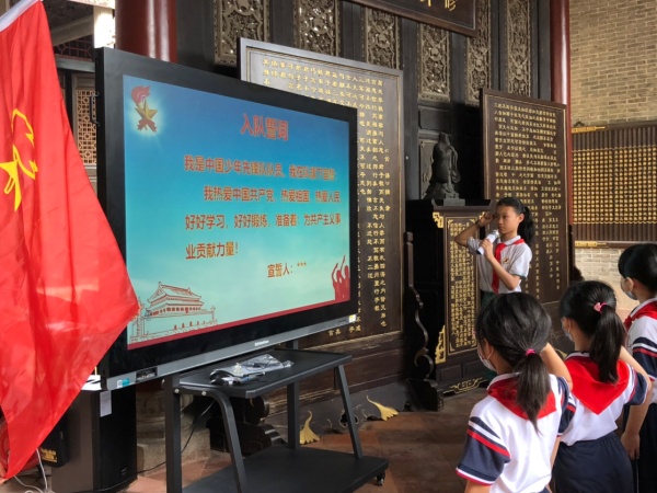 此次活動在線上線下同時進行,入隊隊員及六一中隊在書院進行入隊儀式,其它中隊在教室觀看儀式直播。伴隨著激昂的出旗曲,一年級入隊儀式在全體隊員的期盼中拉開序幕,隊員們齊唱《中國少年先鋒隊隊歌》。接著,大隊輔導員羅永德宣布了新隊員名單,并對新入隊的隊員表示熱烈祝賀。