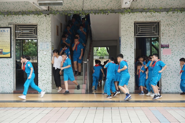 為了演練順利安全地進行,學校制定了詳細的消防逃生演練方案,對各班逃離的路線及每位配班老師的職責、每層樓梯口的值班老師等內(nèi)容都作了明確的規(guī)定。下午3點整,一陣急促的警報聲隨即響徹校園。各班正副班主任迅速到達所任班級維持秩序,帶領學生捂住口鼻,按照疏散要求,將學生沿著學校指定樓梯口快速前進,有序撤離到學校操場的安全區(qū)域。隨即各班主任清點人數(shù),匯報給學校負責安全工作的張觀生主任。杜鎮(zhèn)材副校長對本次消防安全演練作了總結(jié)發(fā)言。他表揚了在演練活動中做得好的班級,并強調(diào)一旦身邊發(fā)生突發(fā)事件,要沉著應對,有效掌握在危險環(huán)境中迅速逃生、自救、互救的基本方法,切實提高抵御和應對緊急突發(fā)事件的能力。