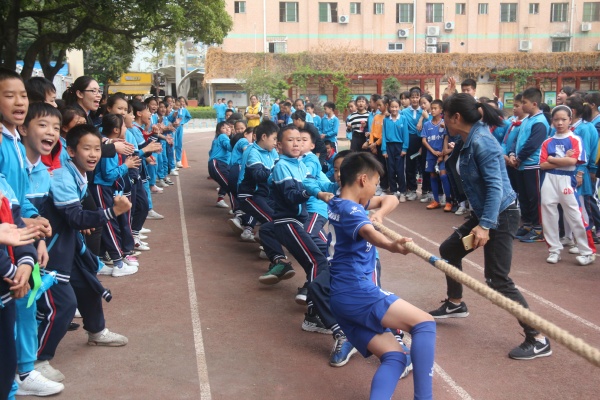 下午是緊張的集體比賽項(xiàng)目,項(xiàng)目分別為四至六年級(jí)的拔河比賽,一至三年級(jí)的50米迎面接力,1分鐘集體跳繩和二人三足迎面接力。在拔河項(xiàng)目和50米迎面接力賽中,體育場(chǎng)上響起了此起彼伏的加油聲。運(yùn)動(dòng)員們?yōu)榱思w榮譽(yù)奮力拼搏,場(chǎng)下的拉拉隊(duì)員們扯著嗓子呼喊,仿佛能通過這種方式給予同伴力量,集體團(tuán)結(jié)的力量在這一刻得到彰顯;在二人三足迎面接力比賽中,小小同伴互相鼓勵(lì),互相喊著口號(hào)“一二,一二,一二……”邁著整齊的步伐,低年級(jí)的弟弟妹妹努力平衡身體,培養(yǎng)與同伴的默契,高年級(jí)的哥哥姐姐們?cè)缫咽炀氄莆?,健步如飛;在一分鐘集體跳繩中,每位同學(xué)都在努力為班上積多一分。