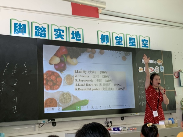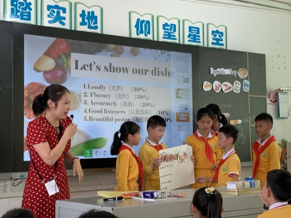 接著,由西區(qū)廣豐小學(xué)的吳曉霞老師執(zhí)教了一節(jié)五年級的閱讀課——Unit 5 School Lunch(Vegetable Soup),吳老師能夠準確把握學(xué)生的年齡特點,以舊引新,圖文并茂,有趣的教學(xué)內(nèi)容,形式多樣的教學(xué)手段,激發(fā)了學(xué)生的參與熱情,引導(dǎo)學(xué)生分析理解文本,找出關(guān)鍵信息,注重發(fā)展學(xué)生的實踐能力和創(chuàng)新精神。
