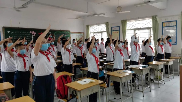 疫情防控之下, “復(fù)學(xué)第一課” 活動主題采取了釘釘直播的模式,由莫秀紅副校長主持。升旗儀式上,當(dāng)國歌緩緩響起,同學(xué)們整齊地佩戴著紅領(lǐng)巾,莊嚴(yán)佇立,注視著屏幕上冉冉升起的國旗。