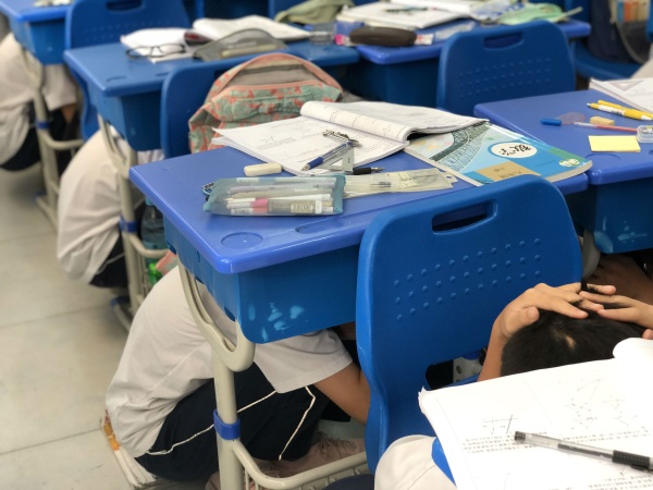 中山一中西區(qū)中學(xué)辦公室主任劉軍生擔(dān)任本次防震疏散演練總指揮。9點(diǎn)20分,劉主任通過校園廣播系統(tǒng)宣布:“現(xiàn)在地震來襲,實(shí)施緊急避險(xiǎn)!”校園里立即響起代表著“地震警報(bào)”信號(hào)的連續(xù)急促哨聲。聽到警報(bào)信號(hào)后,班主任、任課教師清醒鎮(zhèn)定地指導(dǎo)學(xué)生就近蹲在課桌、實(shí)驗(yàn)臺(tái)等遮擋物旁,用書包、書本或其它柔軟物品保護(hù)好頭部。