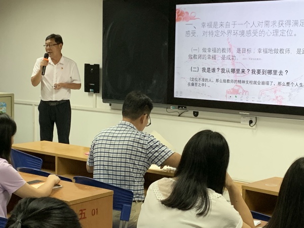 范振海校長從教師幸福感獲得的途徑、快樂工作的方法、淡泊從容的心態(tài)這三方面分享他的心得感悟。做幸福的教師,是目標;幸福地做教師,是踐行;做教師的幸福,是成功。作為人民教師,必須定位精準,從平凡的崗位創(chuàng)造出不平凡,實現(xiàn)自身的人生價值,在價值中獲得快樂。范校長一席話讓教師們醍醐灌頂,教育工作中酸甜苦辣皆有嘗試,有喜有憂、有笑有淚,但必須時刻牢記師德是教師之本,做人民滿意的教師,做幸??鞓返慕處煟@是教育人的終身追求.。