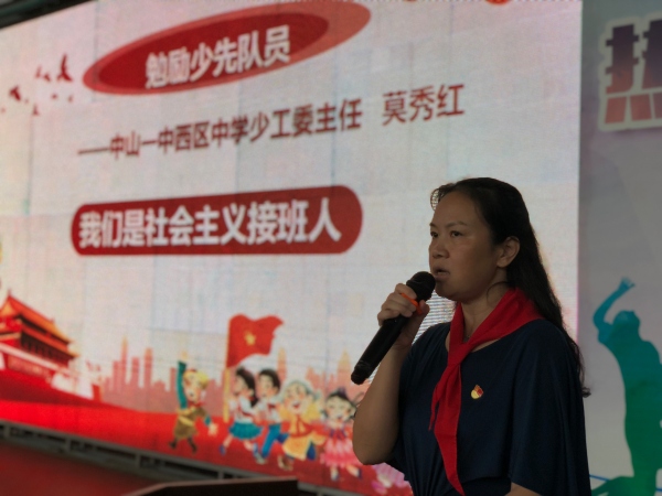 為達(dá)到“節(jié)儉、隆重、熱烈”慶祝少先隊建隊70周年的目標(biāo),讓全校師生更好地感受中國共產(chǎn)黨及少先隊70年來的奮斗歷程,教育引導(dǎo)廣大少先隊員聽黨的話、跟黨走,用實際行動把紅色基因一代代傳下去,增強(qiáng)少先隊員的光榮感及國家和民族自豪感,展現(xiàn)集團(tuán)化辦學(xué)背景下的中山一中西區(qū)中學(xué)的良好精神風(fēng)貌,進(jìn)一步打造“志存高遠(yuǎn)、和諧發(fā)展”的校園文化氛圍。10月8日上午,李媚娟老師主持了中山一中西區(qū)中學(xué)慶祝中國少年先鋒隊建隊70周年啟動儀式。