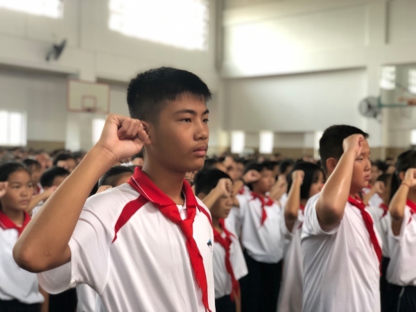 最后,在大隊輔導(dǎo)員蔡潔瑩老師的帶領(lǐng)下,同學(xué)們舉起右手,莊嚴(yán)宣誓:“我是中國少年先鋒隊隊員,我在隊旗下宣誓……”同學(xué)們激情澎湃,響徹校園的呼號聲和歌聲彰顯著每一位中山一中西區(qū)中學(xué)少先隊員勵志學(xué)習(xí)、成就自我的決心。