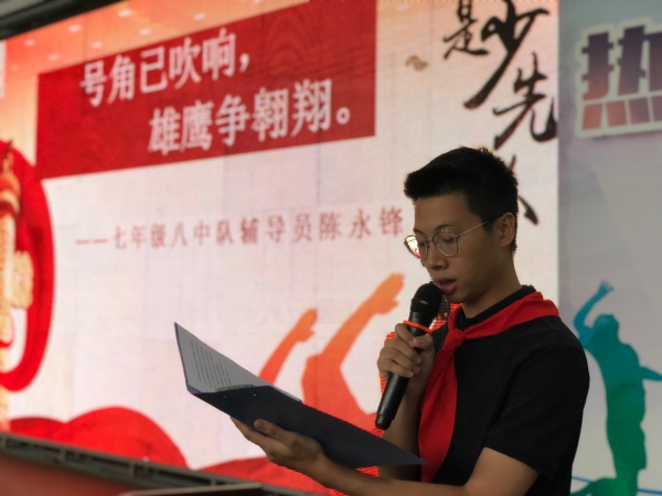 少先隊中隊輔導(dǎo)員陳永鋒老師發(fā)表主題為“號角已吹響,雛鷹爭翱翔”的講話,陳老師講到2019 年是重大節(jié)日、紀(jì)念日較為集中的一年,五四運動 100 周年、新中國成立 70 周年、少先隊建隊 70 周年等時間節(jié)點使得青少年思想政治引領(lǐng)工作更顯重要,學(xué)校少工委以今天的“號角已吹響,雛鷹爭翱翔”主題活動為契機(jī),增強(qiáng)少先隊員光榮感,幫助中學(xué)少先隊員快樂度過這承上啟下的重要人生階段,為廣大少先隊員的健康成長和全面發(fā)展保駕護(hù)航。他叮囑并激勵著少先隊員們應(yīng)時刻準(zhǔn)備著,為實現(xiàn)中華民族偉大復(fù)興貢獻(xiàn)力量!