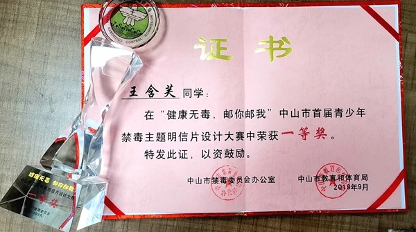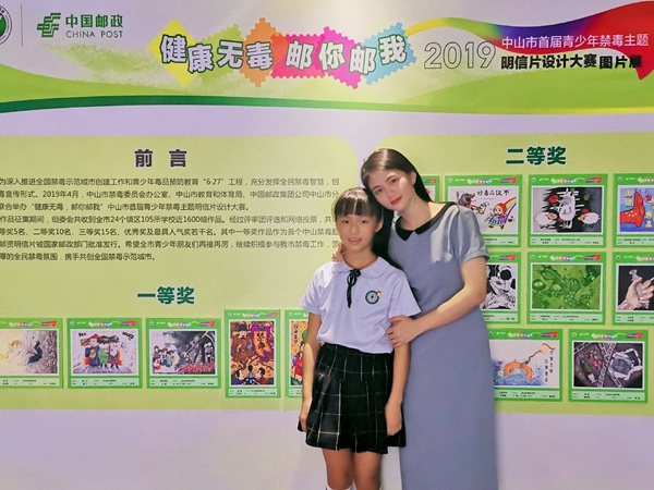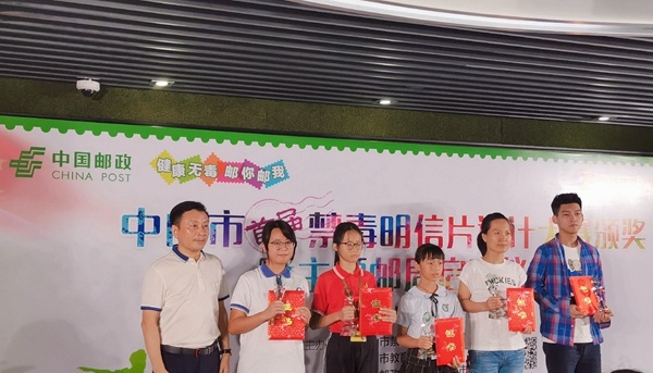 9月19日,在中山市禁毒教育科普館舉行中山市首屆禁毒明信片設(shè)計(jì)大賽頒獎(jiǎng)暨主題郵局啟動(dòng)儀式。根據(jù)審團(tuán)評(píng)選和網(wǎng)絡(luò)投票,中山市西區(qū)鐵城小學(xué)的王含芙同學(xué)獲得一等獎(jiǎng)(全市5個(gè)一等獎(jiǎng)名額)、楊謹(jǐn)寧同學(xué)獲得優(yōu)秀獎(jiǎng),林秀媚老師被評(píng)為“優(yōu)秀指導(dǎo)老師”。據(jù)悉,王含芙的作品也作為首個(gè)中山市禁毒題材的郵資明信片,被國(guó)家郵政部門(mén)批準(zhǔn)發(fā)行。頒獎(jiǎng)嘉賓表示,希望全市青少年再接再厲,繼續(xù)積極參與中山市禁毒工作,營(yíng)造濃厚的全市禁毒氛圍,攜手共創(chuàng)全國(guó)禁毒示范城市。