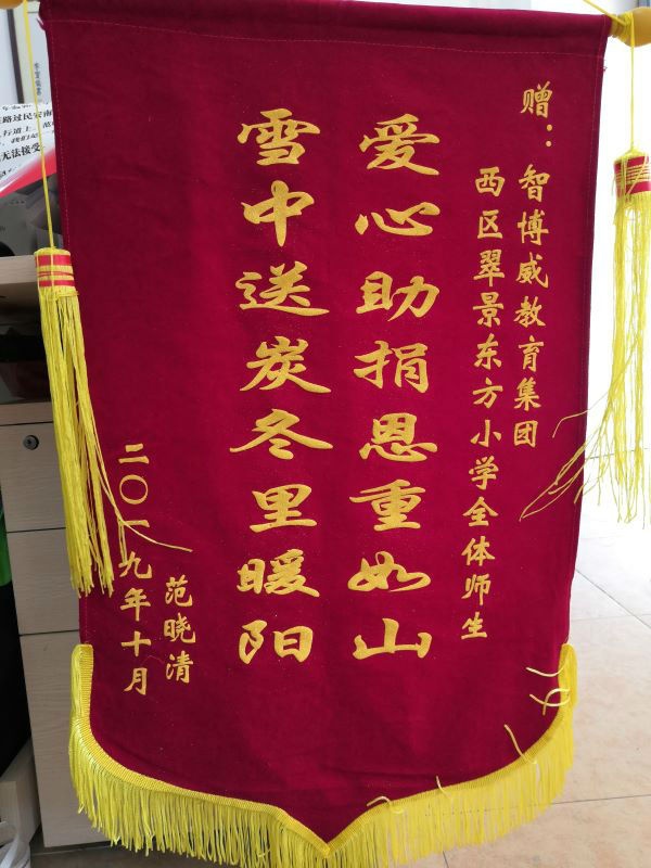 11月5日上午,翠景東方小學(xué)收到一面寫著“愛心助捐恩重如山 雪中送炭冬里暖陽”的錦旗和一封感謝信。東升鎮(zhèn)華盛學(xué)校六年級和三年級的學(xué)生范雪、范峻博的家長送來的,以表示他們對翠小全體師生的感激之情。