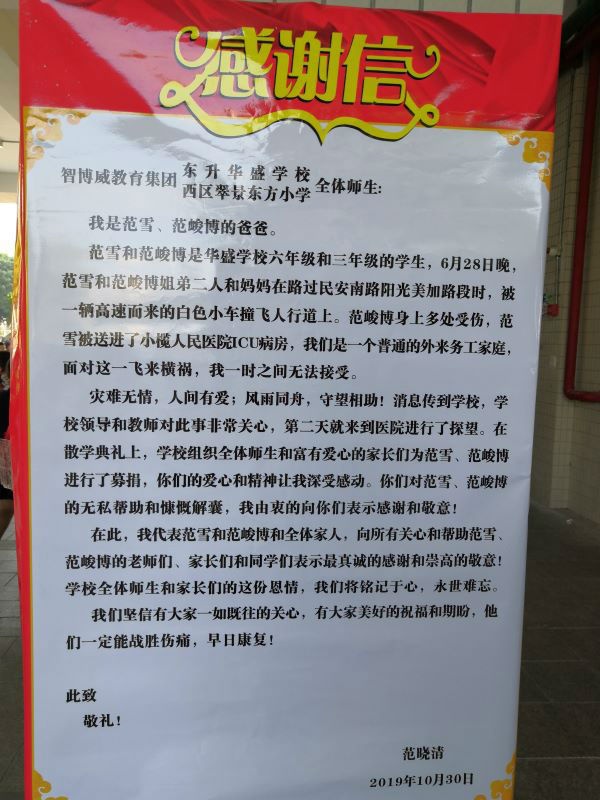 據(jù)悉,6月28日晚,范雪和范峻博姐弟二人和媽媽在路過民安南路陽光美加路段時,被一輛高速而來的白色小車撞飛人行道上。范峻博身上多處受傷,范雪被送進了小欖人民醫(yī)院ICU病房,做為一個普通的外來務(wù)工家庭,面對這一飛來橫禍,家長一時之間無法接受,更無經(jīng)濟能力給孩子們醫(yī)治。但是災(zāi)難無情,人間有愛;風(fēng)雨同舟,守望相助!消息傳到翠景東方小學(xué)后,學(xué)校領(lǐng)導(dǎo)和全體教師對此事非常關(guān)心,第二天就委派代表去到醫(yī)院對兩個孩子進行了探望,并利用散學(xué)典禮組織全體師生和富有愛心的家長為兩個孩子進行了募捐活動,解決了他們的燃眉之急。范同學(xué)的家長被翠小師生及家長們的深情所感動,在孩子的病情穩(wěn)定之時,特意抽出時間準(zhǔn)備了錦旗和感謝信向翠小全體師生表示感謝。