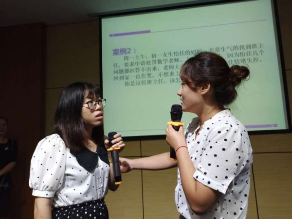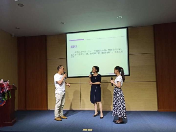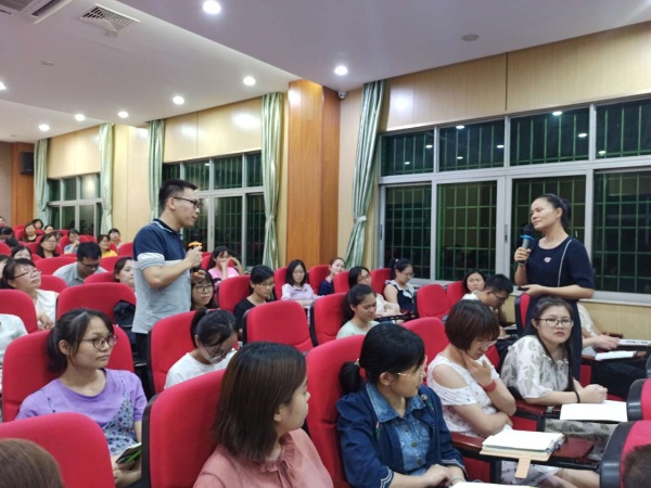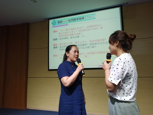 通過(guò)學(xué)生與老師、家長(zhǎng)與老師的案例演練,老師們了解到溝通的技巧。理論與實(shí)踐相結(jié)合的模擬場(chǎng)面讓現(xiàn)場(chǎng)氣氛推上高潮。老師們積極參與,與彭老師傾情互動(dòng),精彩表演溝通中的片段故事,現(xiàn)場(chǎng)笑聲不斷,其樂(lè)融融。于詼諧幽默中傳授溝通的藝術(shù),在輕松愉悅中提高自己的素養(yǎng)。 其中,在案例二“當(dāng)家長(zhǎng)與老師發(fā)生沖突時(shí),班主任應(yīng)該怎么做?”中,路海云校長(zhǎng)將自己的親身經(jīng)歷帶進(jìn)本次培訓(xùn),讓老師們明白,處理任何糾紛,學(xué)會(huì)傾聽(tīng),堅(jiān)持底線,積極溝通,更容易達(dá)成一致。