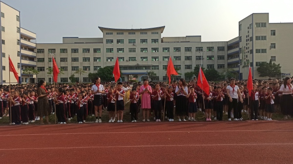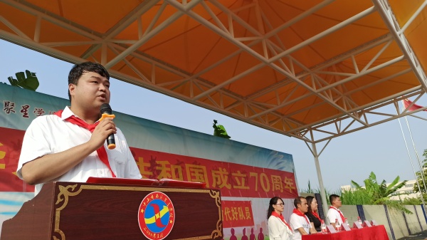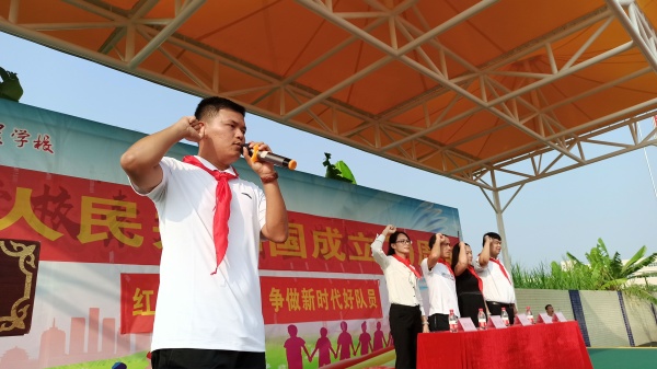 在張馨彤隊(duì)員的指揮下,全場(chǎng)所有人員進(jìn)行了唱隊(duì)歌活動(dòng)。大隊(duì)長(zhǎng)張若詩(shī)帶領(lǐng)全體隊(duì)員重溫入隊(duì)誓詞。聚星學(xué)校少工委副主任張帥校長(zhǎng)和聚星學(xué)校大隊(duì)輔導(dǎo)員譚治偉老師分別進(jìn)行了隊(duì)旗下講話(huà)。少工委副主任張帥校長(zhǎng)首先給現(xiàn)場(chǎng)全體少先隊(duì)員致予了節(jié)日的問(wèn)候,隨后他告誡所有隊(duì)員和輔導(dǎo)員們,要不忘初心,牢記使命,今天幸福美好的生活是前輩用鮮血和生命換取回來(lái)的,要愛(ài)護(hù)紅領(lǐng)巾,愛(ài)護(hù)隊(duì)旗,從小立志做個(gè)有用之才,長(zhǎng)大要投身到祖國(guó)需要的地方,去建設(shè)國(guó)家,去回饋社會(huì)。輔導(dǎo)員譚治偉老師則告訴所有隊(duì)員:少先隊(duì)經(jīng)歷了70年的風(fēng)風(fēng)雨雨,從當(dāng)年的勞動(dòng)童子軍到今天的少年先鋒隊(duì),幾十年的風(fēng)雨歷程,這個(gè)光輝的組織始終跟著中國(guó)共產(chǎn)黨,與祖國(guó)同呼吸,共命運(yùn)。希望廣大少先隊(duì)員好好學(xué)習(xí),好好做人,從講禮貌、愛(ài)護(hù)花草、愛(ài)護(hù)公共物品等小事做起,讓鮮艷的紅領(lǐng)巾永遠(yuǎn)飄揚(yáng)在心中。最后,伴隨著“時(shí)刻準(zhǔn)備著!”呼號(hào)聲,活動(dòng)落下了帷幕。
