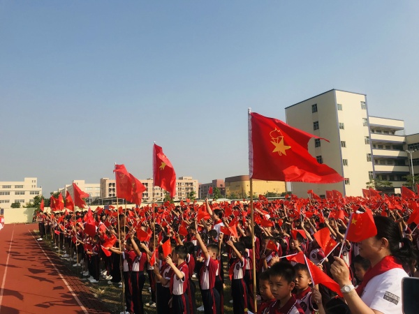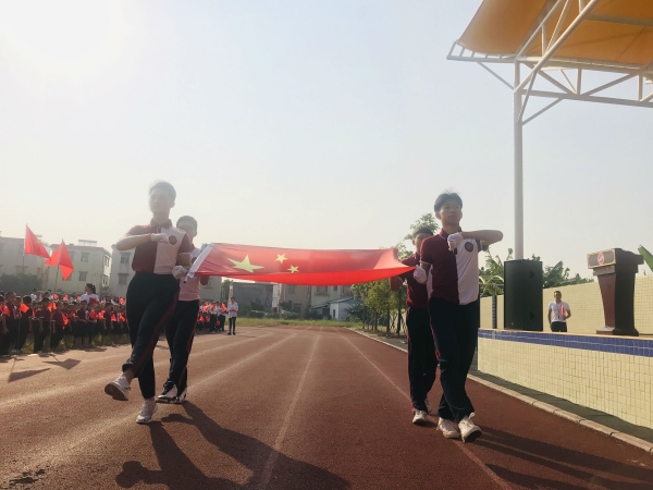 8時(shí)整,同學(xué)們身著統(tǒng)一的校服,佩戴紅領(lǐng)巾,排著整齊的隊(duì)伍走進(jìn)操場(chǎng)。伴著激昂的出旗樂曲,小小的護(hù)旗手們,托舉著國旗,邁著矯健的步伐,雄赳赳氣昂昂地將國旗護(hù)到主席臺(tái)。《義勇軍進(jìn)行曲》在操場(chǎng)上空響起,全體少先隊(duì)員齊唱國歌、行隊(duì)禮。鮮艷的五星紅旗徐徐升起、迎風(fēng)飄揚(yáng),昭示著聚星學(xué)校的孩子們?cè)谛腋5臅r(shí)代里健康快樂地成長。