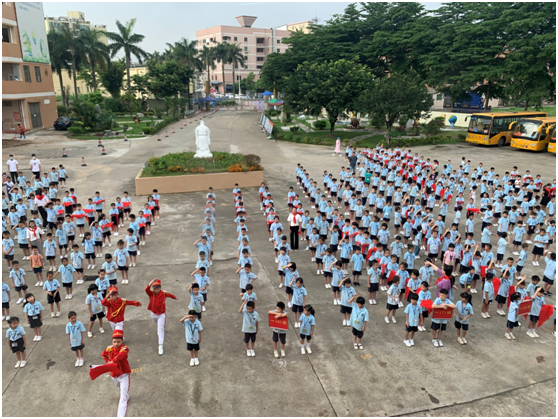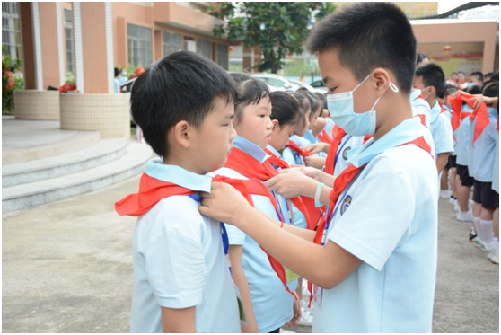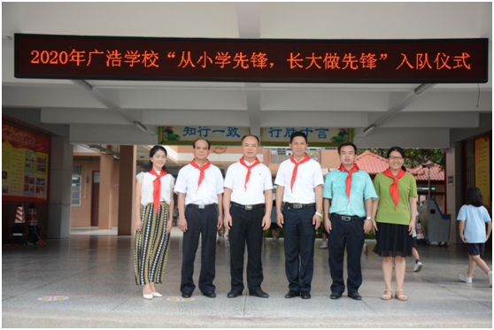 隊(duì)旗飄飄,星星火炬閃耀,為慶?!傲弧眱和?jié),2020年5月29日早上,中山市廣浩學(xué)校少先大隊(duì)部組織一年級學(xué)生舉行隆重的“從小學(xué)先鋒,長大做先鋒”主題入隊(duì)儀式。廣浩學(xué)校黨支部書記楊善德、少工委主任黃飛躍、德育處許向陽主任、梁超勝主任、團(tuán)委莫欣老師、少先大隊(duì)輔導(dǎo)員陳燕坪老師出席了入隊(duì)儀式。