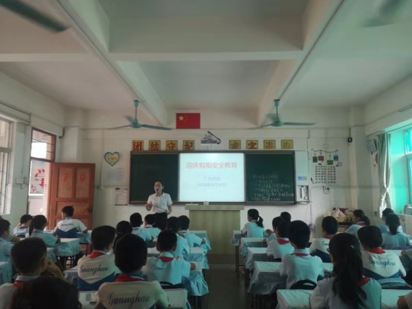 為貫徹落實(shí)“十一”長假期間學(xué)校對于學(xué)生安全教育及管理工作方面的要求,確保廣浩學(xué)校學(xué)生能夠提高自我防護(hù)意識,度過一個(gè)安全愉快的假期。9月30日,廣浩學(xué)校德育處組織全體師生開展國慶節(jié)放假安全教育主題班會(huì)。