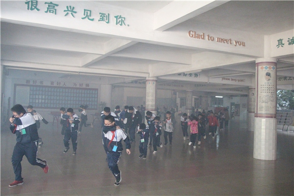 8點(diǎn)55分,校園內(nèi)響起消防警報(bào)聲,全校3000多名師生在安全引導(dǎo)員的組織下,從教室前后門分別快速、在走廊集隊(duì),并按計(jì)劃分班級(jí)迅速下樓梯到操場(chǎng)集合。在隊(duì)伍行進(jìn)中,同學(xué)們都能把老師傳授的逃生知識(shí)應(yīng)用到演練中,彎腰、低頭、捂鼻等動(dòng)作都做得非常規(guī)范到位。本次演練使用了消防專用煙霧彈,逃生現(xiàn)場(chǎng)出現(xiàn)了大量黃色煙霧,增加了逼真的火災(zāi)情形。7分鐘后,全校師生都安全到達(dá)操場(chǎng)的指定位置。在預(yù)定的時(shí)間內(nèi)完成了逃生演習(xí),速度較快,隊(duì)形隊(duì)列整齊劃一,逃生時(shí)的身體姿勢(shì)規(guī)范到位,各班級(jí)輔導(dǎo)員老師指揮得力。到達(dá)操場(chǎng)后,同學(xué)們雙手護(hù)頭蹲下,安靜的等候指令。