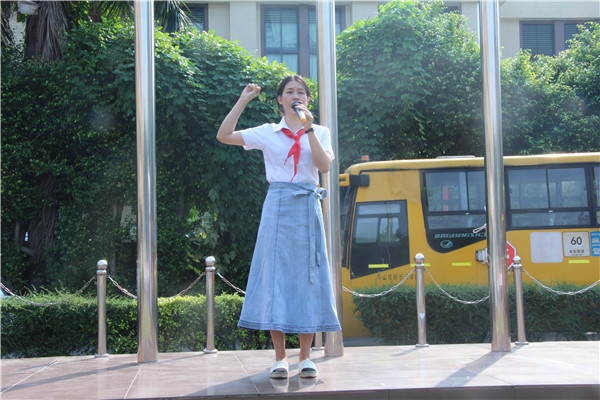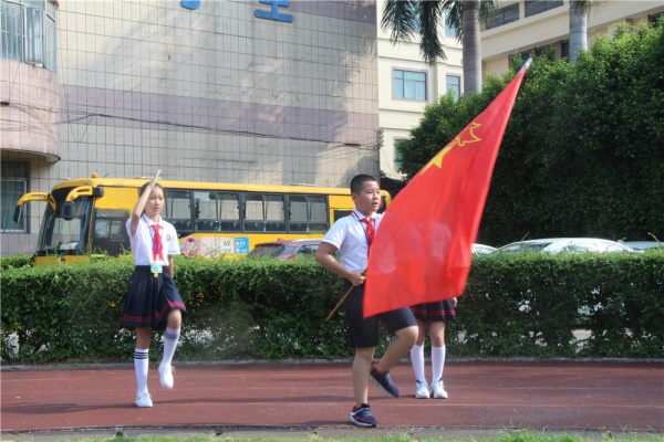 新長江慶祝建隊70周年的主題儀式活動在朝氣蓬勃的《出旗曲》中拉開了帷幕。三名大隊委踏著堅實(shí)的步伐出隊旗,操場中的少先隊員們向隊旗敬隊禮,整個出旗儀式莊重而嚴(yán)肅。隨后七年級二班的大隊委林夏錫走上旗臺指揮所有少先隊員唱隊歌。