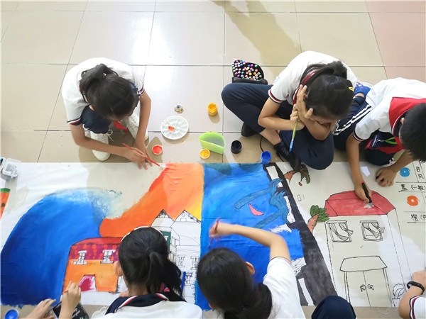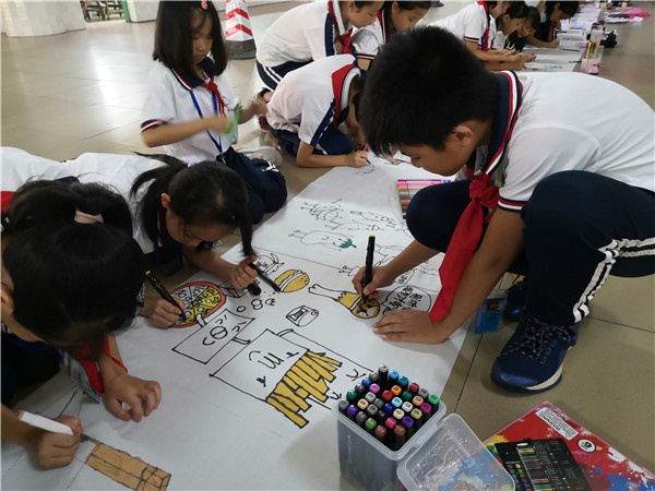 1點(diǎn)40分,活動(dòng)正式開(kāi)始,百米長(zhǎng)卷一地鋪開(kāi),170多名小畫家或蹲、或趴,或席地而坐,手握五彩的畫筆,所畫體裁多樣,兒童畫、油棒畫、水彩畫、水粉畫等都出現(xiàn)在花卷上。他們年紀(jì)雖小,但技巧熟練,在勾勒出的框架中開(kāi)始在畫卷上輕描淡寫:描繪、調(diào)色、渲染,每個(gè)步驟一氣呵成,色彩使用大膽,層次分明,學(xué)生們雖然畫姿各異,但是那份認(rèn)真與專注卻又十分統(tǒng)一,快樂(lè)的笑容、張揚(yáng)的姿態(tài),此次活動(dòng)經(jīng)歷必然成為他們寶貴的回憶。