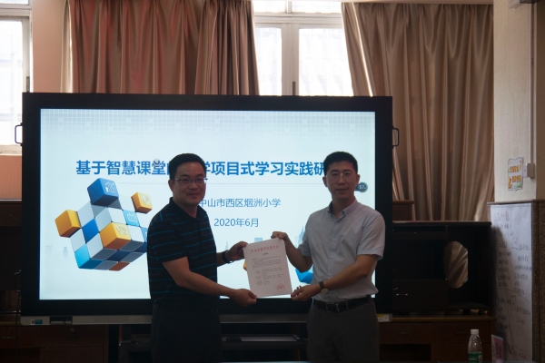 黃文華校長(zhǎng)就項(xiàng)目情況與專家意見作表態(tài)性發(fā)言,項(xiàng)目管理單位代表陳志豪老師為項(xiàng)目單位代表煙洲小學(xué)黃文華校長(zhǎng)頒發(fā)項(xiàng)目立項(xiàng)通知書。中山市西區(qū)煙洲小學(xué)教育信息化專項(xiàng)培育項(xiàng)目成功啟動(dòng),本次會(huì)議在熱烈的掌聲中圓滿結(jié)束。