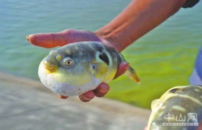 嘟嘴,胖腹,瞪眼,青背白肚,放在手中片刻,白白的肚子便鼓起來,遠遠望去就像一個圓滾滾的氣球。1月15日下午,在?;菟a(chǎn)養(yǎng)殖基地,員工唐伯撐著小木船,劃到魚塘中央,提起喂料魚罾,將近10條河鲀魚放進大盆中,供大家觀看。