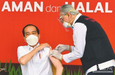 佐科通過電視直播展示了自己接種疫苗的過程。總統(tǒng)醫(yī)生團隊成員對著直播鏡頭展示了疫苗包裝盒,隨后在佐科的左臂上注射了新冠疫苗。