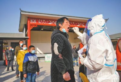 18日,檢測人員在河北省隆堯縣隆堯鎮(zhèn)東河村為村民進行核酸檢測。
