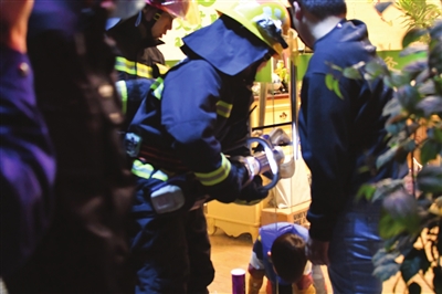 1月3日傍晚,一名男童頭部被玻璃門夾住,消防員到場救援。(中山消防供圖)